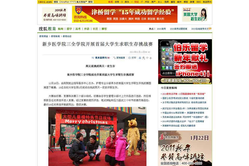 本网讯 2011年1月11日,《搜狐网》在当日《教育动态》栏目头条以《新乡医学院三全学院开展首届大学生求职生存挑战赛》为题,综合新闻报道我院大学生求职生存挑战赛。学院领导对这次大赛给予高度重视。12月25日上午,在求职生存挑战赛决赛的启动仪式上,党委书记王志凯指出,就业是民生之本,大学生就业关系到每年数百万毕业生的前途,牵动着数千万在校大学生的思想和心态,关系着成千上万家庭的幸福与和谐。做好大学生就业指导工作,是新的历史条件下高等教育改革发展、提高质量和办好让人民满意教育的必然要求。他鼓励参赛选手珍惜来之不易的锻炼机会,在确保人身安全的前提下,自觉配合监督员和助理的工作,认真履行参赛人员的义务,迎接挑战,接受考验,超越自我。详情请点击: