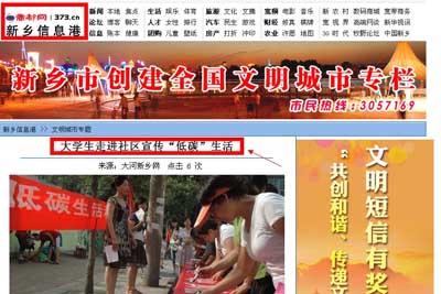 本网讯 7月21日,《商都网新乡信息港》以《大学生走进社区宣传“低碳”生活》为题,图文报道我院暑期社会实践活动。由我院21名学生组成的“大学生低碳环保服务队”在我市黄河口社区举行“低碳生活进社区”活动。队员们在现场为市民发放了环保手提袋和问卷调查,旨在让“低碳”生活走进市民心中。在此次活动中,队员向社区居民分发了5000张宣传页,2000张调查问卷以及500个印有“绿色环保,从我做起”字样的环保手提袋,以增强市民的环保意识。在2010年世博会举行、新乡市创建文明城市的大背景下,倡导“低碳生活”在新乡似乎已经成为一股潮流。“大学生低碳环保服务队”联合黄河口社区共同举办这次活动,旨在让更多的市民加入到“低碳”一族,共同呵护新乡的碧水蓝天。