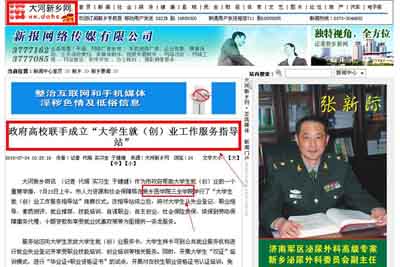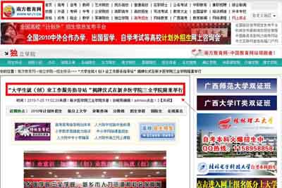 7月25日《南方教育网》以《“大学生就(创)业工作服务指导站”揭牌仪式在新乡医学院三全学院隆重举行》进行图文报道报道。我院“大学生就(创)业工作服务指导站”的建立,是政府为大学生创业营造良好的社会环境和提供必要创业扶持的重要举措,表明政府着力帮助大学生就业的态度和决心。学院一定能将“大学生就(创)业工作服务指导站”建设成为运行有序、服务到位、作用明显的就业创业服务窗口,为我院大学生就(创)业提供全方位指导和服务,为新乡创建全民创业型城市做出贡献! 详情请点击以下网址: 南方教育网:http://www.nfjy.cn/html/20100725/20100725105936.htm 大河新乡网:http://news.xxrb.com.cn/2010/0724/39530.html