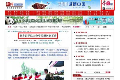 本网讯 7月23日,《中国网》以《新乡医学院三全学院慰问到军营》为题,图文报道我院大学生文艺下乡服务队到部队进行文艺演出活动。学院对此次慰问演出活动十分重视,节目均是经过层层选拔、精心编排,具有较高的思想性和艺术性。另外学院还为部队官兵送去了毛巾、肥皂等慰问品,对部队官兵帮助该院圆满完成军训等教育教学任务表示衷心感谢,并对广大官兵致以崇高的敬意和节日的问候。