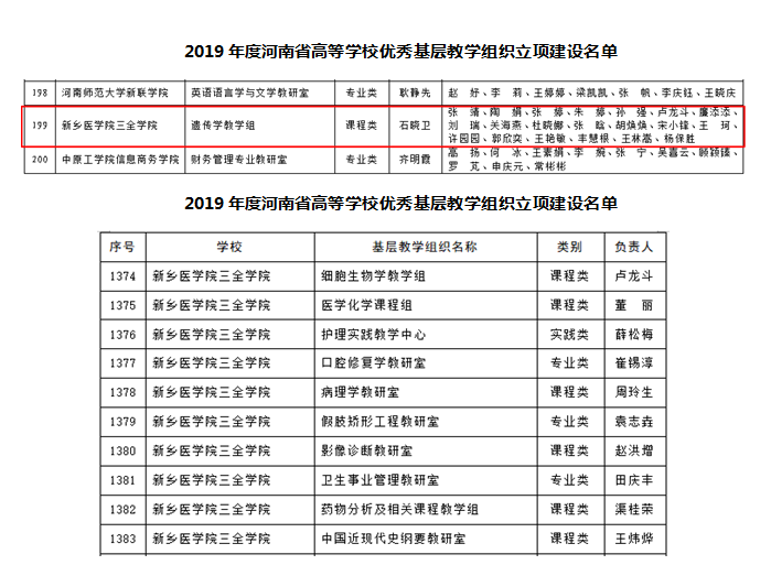 8. 我校11个基层教学组织获批2019年度河南省高等学校基层教学组织达标创优立项建设,基层教学水平再上新台阶 11月,我校遗传学教学组、细胞生物学教学组、医学化学课程组、护理实践教学中心、口腔修复学教研室、病理学教研室、假肢矫形工程教研室、影像诊断教研室、卫生事业管理教研室、药物分析及相关课程教学组、中国近现代史纲要教研室等11个基层教学组织获批2019年度河南省高等学校基层教学组织达标创优立项建设。这些达标创优的立项建设,充分表明我校基层教学组织的建设水平和教学水平的提升。