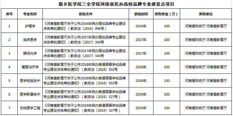 5. 生物医学工程、医学影像技术专业荣获“2019年河南省民办普通高等学校品牌专业建设点”,学科专业结构进一步优化 8月,河南省教育厅下发《关于公布2019年民办普通高等学校品牌专业建设点名单的通知》(教政法〔2019〕527号)文件,我校生物医学工程、医学影像技术两个专业入选“2019年河南省民办普通高等学校品牌专业建设点”,并获得专项建设资金200万元。护理学获批河南省一流本科专业建设点。这是我校专业建设在突出特色、打造品牌方面取得的重要成果。截至目前,我校4个专业获得省级综合改革试点专业项目,7个专业获得河南省民办普通高等学校品牌专业建设点。