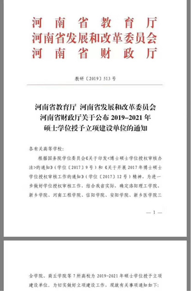 4. 我校获批硕士学位授予立项建设单位,助推学校办学实力和水平提升 8月,河南省教育厅、河南省发展和改革委员会、河南省财政厅联合下发《关于公布2019-2021年硕士学位授予立项建设单位的通知》(教研〔2019〕513 号),我校获批硕士学位授予立项建设单位。本次我校拟申请智能医学、生物与医药、健康管理、眼视光技术、康复医学养老护理、生物医学工程等六个硕士学位授权点。获批硕士学位立项建设单位,对增强我校核心竞争力、进一步提升办学水平和建设高水平应用型大学具有重大意义。