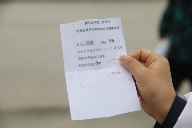 随着各大高校陆续开始放寒假,大学生返程高峰期到来。为方便学生回家,1月11日、12日,新乡医学院三全学院协调了7辆大巴,免费送900多名建档立卡和特殊贫困学生回家。与此同时,三全学院平原校区的近万名普通学生也将享受乘车5元爱心减免的好政策。 虽说是大学生返程高峰期,但三全学院大二学生小朱一点也不担心寒假回家这个问题。11日上午8时许,收拾好行李的她来到学务大厅2号窗口。学校老师在查验过她的一卡通后,就把一张免费乘车单递到了她的手中。有了这张乘车单,小朱坐车去新乡火车站是免费的。 来到乘车点后,小朱发现有很多同学已经在车上了,让她意外的是,现场还有辅导员和学生志愿者帮忙搬行李。她说:“我们学校离新乡火车站和郑州新北站都比较远,学校这样的安排,真的很贴心。” “像小朱领取的免费乘车单,我们学务部一共准备了983张,学校的建档立卡和特殊困难学生均可凭有效证件来领取。非建档立卡和困难学生,在乘坐车辆的时候,也有每人减免5元的优惠。”负责免费乘车单发放工作的马斌介绍。 学生们舒心回家的背后是老师们的默默付出。11日早晨7时20分,精诚书院辅导员张阳就来到了图书馆东门。作为辅导员,他的主要任务是负责现场秩序、组织学生登车和帮忙搬运行李。因为来得早,学生还没有到,只有几个负责运送学生的大巴师傅在闲聊。 考虑到学生随时都可能拉着行李来,张阳选择站在车旁等候。只是风太大,他不得不缩起脖子,把手藏在口袋内取暖。就这样,在冷风里等了40分钟后,第一个拖着行李的学生出现了。 “去郑州还去新乡?”张阳热情地询问。得知对方去郑州后,他指着一辆大巴笑着说:“这是去郑州的,上这辆车吧,我给你放行李。”那神情、模样就像邻家大哥哥一样亲切有爱。 回家的学生逐渐多了起来,张阳和现场的志愿者开始忙碌起来。在他们的协助下,学生们轻松有序地走上了回家的车。上午9时30分,第一辆坐满学生的大巴出发。在冷风里冷透了的张阳也终于有机会搓手取暖。 据了解,“温暖回家路”活动是三全学院寒假送温暖活动的一部分,根据学校放假时间,分析学生离校返家高峰期后,学校向市客运公司协调了7辆大巴,分别发往新乡火车站和郑州新北站两个站点,郑州平均每半个小时发一次,新乡平均每一个小时发一次车,最大限度地为回家的学生提供方便。